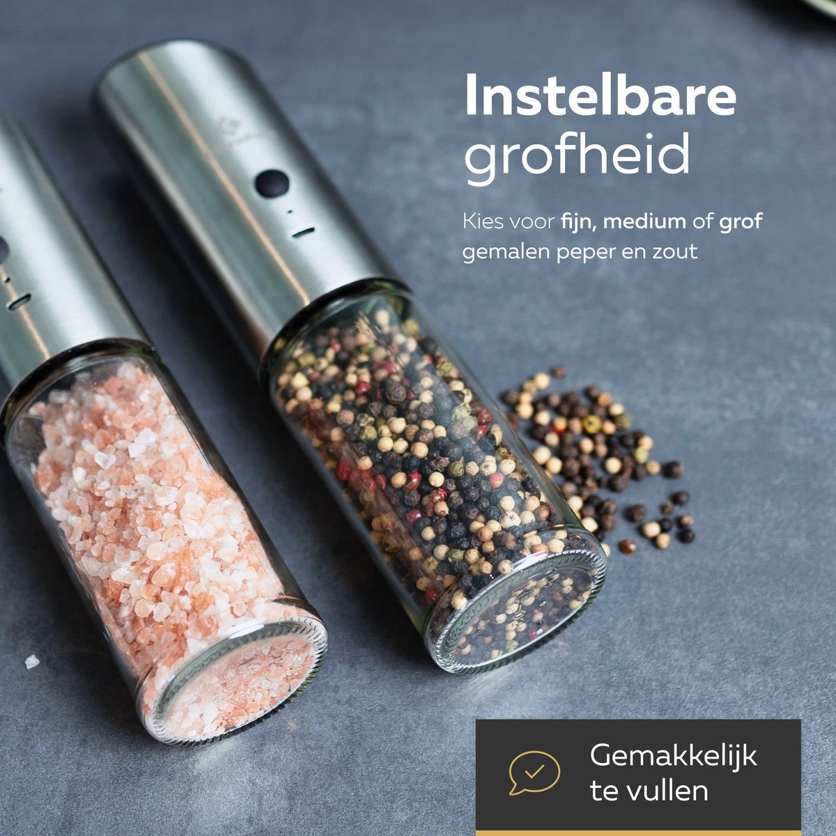 ▶ Premium RVS – De luxe zout- en pepermolen bestaat volledig uit hoogwaardige RVS materiaal en is met zijn modern design en strak afgewerkt materiaal een mooie aanvulling in iedere keuken.