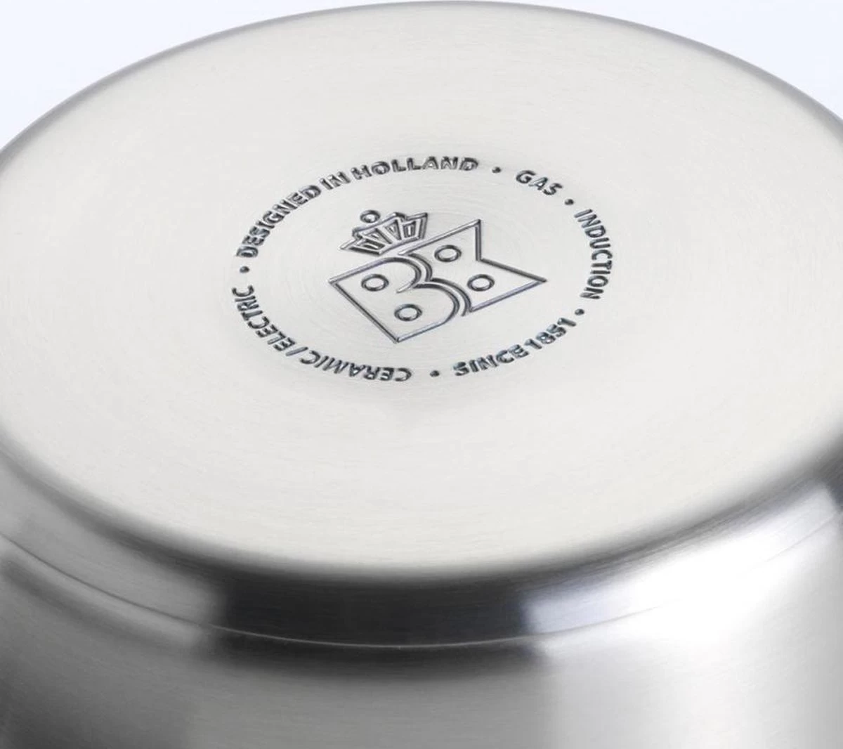 BK Blue label is van alle gemakken voorzien, zodat elke kookbereiding vlekkeloos verloopt. BK Blue label heeft een ingekapselde sandwichbodem die zorgt voor een snelle opwarming en goede warmteverdeling door de hele pan. De body en bodem lopen vloeiend en afgerond in elkaar over wat zorgt voor moeiteloos omroeren en eenvoudige reiniging. De grepen en stelen liggen prettig in de hand en zorgen voor een goede grip tijdens het kookproces. De bovenrand van de pan is omgekruld tot een handige schenkrand om afgieten en schenken gemakkelijker te maken. In de binnenkant van de pan zit een maatverdeling, die altijd zorgt voor een afgepast resultaat. BK Blue label is geschikt voor alle warmtebronnen, inclusief de oven.