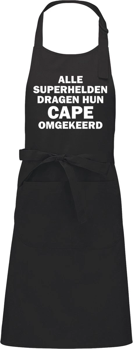 Deze ALLE SUPERHELDEN DRAGEN HUN CAPE OMGEKEERD heren schort is leverbaar als One Size fits all (Volwassenen) maat en zijn leverbaar in de volgende kleuren: