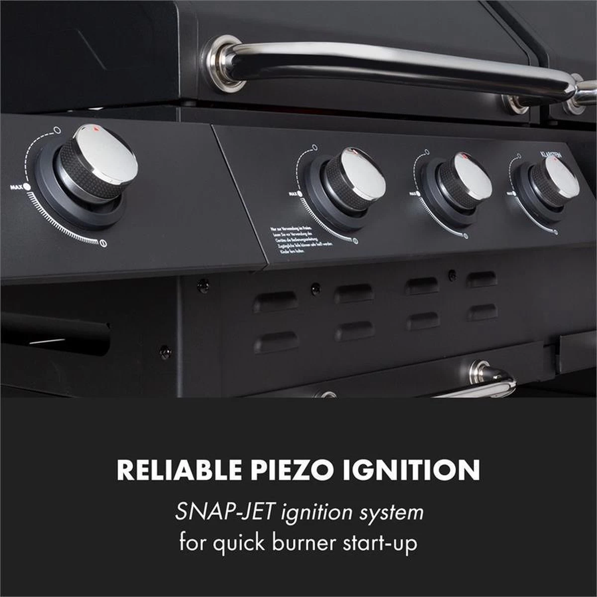Na de aansluiting van een gasfles zorgt de piezo-ontsteker dankzij het SNAP-JET Ignition-System voor de snelle start van de brander: een druk op de draaiknop is voldoende en al meteen is gasbarbecue gebruiksklaar. De krachtige warmte van de drie hoofdbranders en een zijbrander van rvs met een totaal vermogen van 13,5 kW zorgt ervoor dat verschillende gerechten buitengewoon goed gebarbecued kunnen worden. Op de beide gietijzeren grillroosters met een enorme afmeting van elk 53 x 45 cm worden met name steaks en andere vleesspecialiteiten perfect tot in de puntjes toebereid: door de hoge temperaturen wordt het vlees van buiten krokant en van binnen zacht en mals. De hitte wordt dankzij het deksel met de dubbele wand bijzonder goed aan de binnenkant gehouden, twee thermometers geven te allen tijde informatie over de actuele temperaturen.